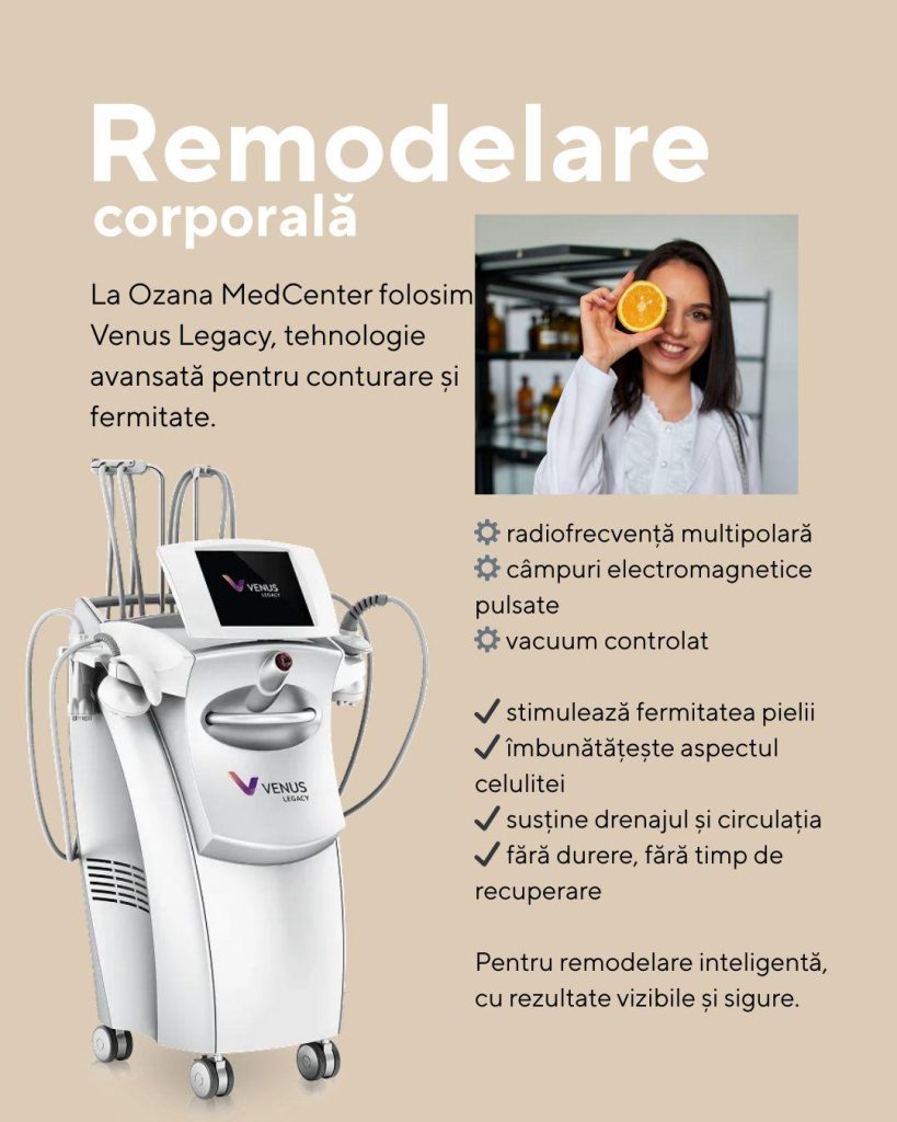 Pentru redefinirea siluetei, oferim remodelare corporală cu Venus Legacy, tehnologie bazată pe radiofrecvență multipolară și câmp electromagnetic pulsatoriu.
